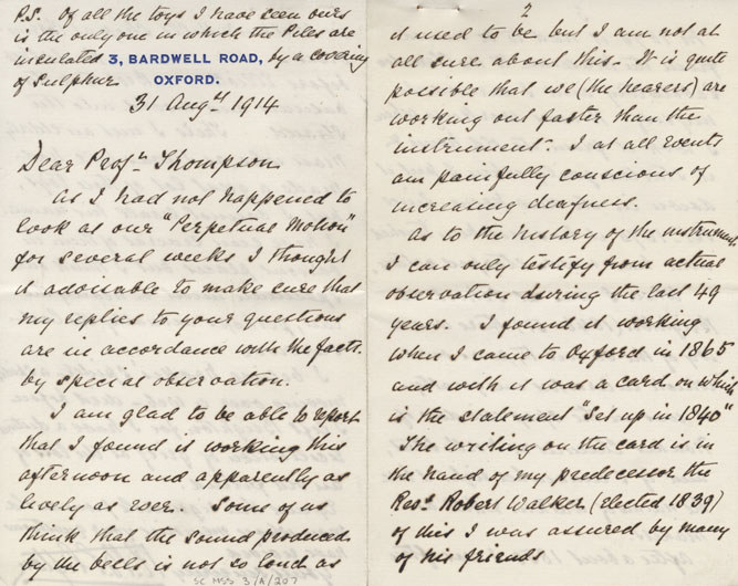 In this letter R B Clifton, who is writing to Professor Silvanus P Thompson, is clearly answering earlier questions put to him by Thompson about the ‘perpetual motion’ machine, also called a ‘toy’ by Clifton which was held at Oxford University’s Clarendon Laboratory.