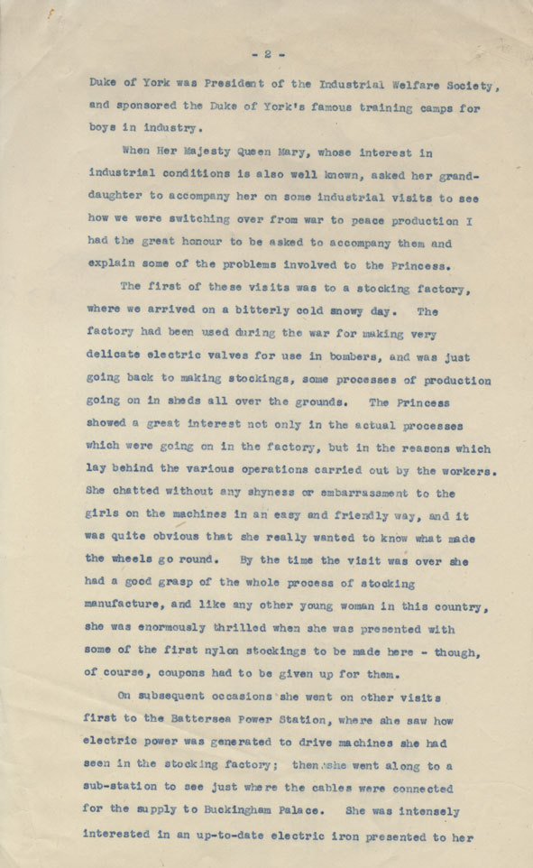 The two images below show Princess Elizabeth, the year before the broadcast, with her grandmother Queen Mary during an industrial visit to Battersea Power Station in April 1946, a visit that is referred to in the broadcast script.