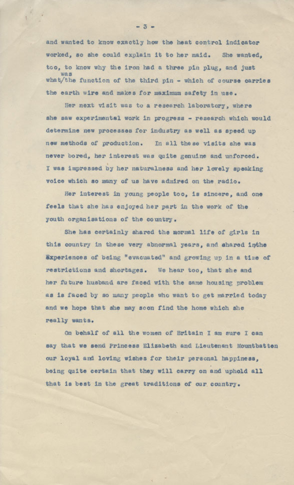 Dame Caroline’s script which is reproduced in full below, discusses the life of the young Princess whilst she was growing up, mentions her interest in industry, and describes some of the visits with which the Princess was involved. Finally Dame Caroline sends ‘loyal and loving wishes’ to Princess Elizabeth and expresses her certainty that the newly engaged couple will ‘carry on and uphold all that is best in the great traditions of our country’.