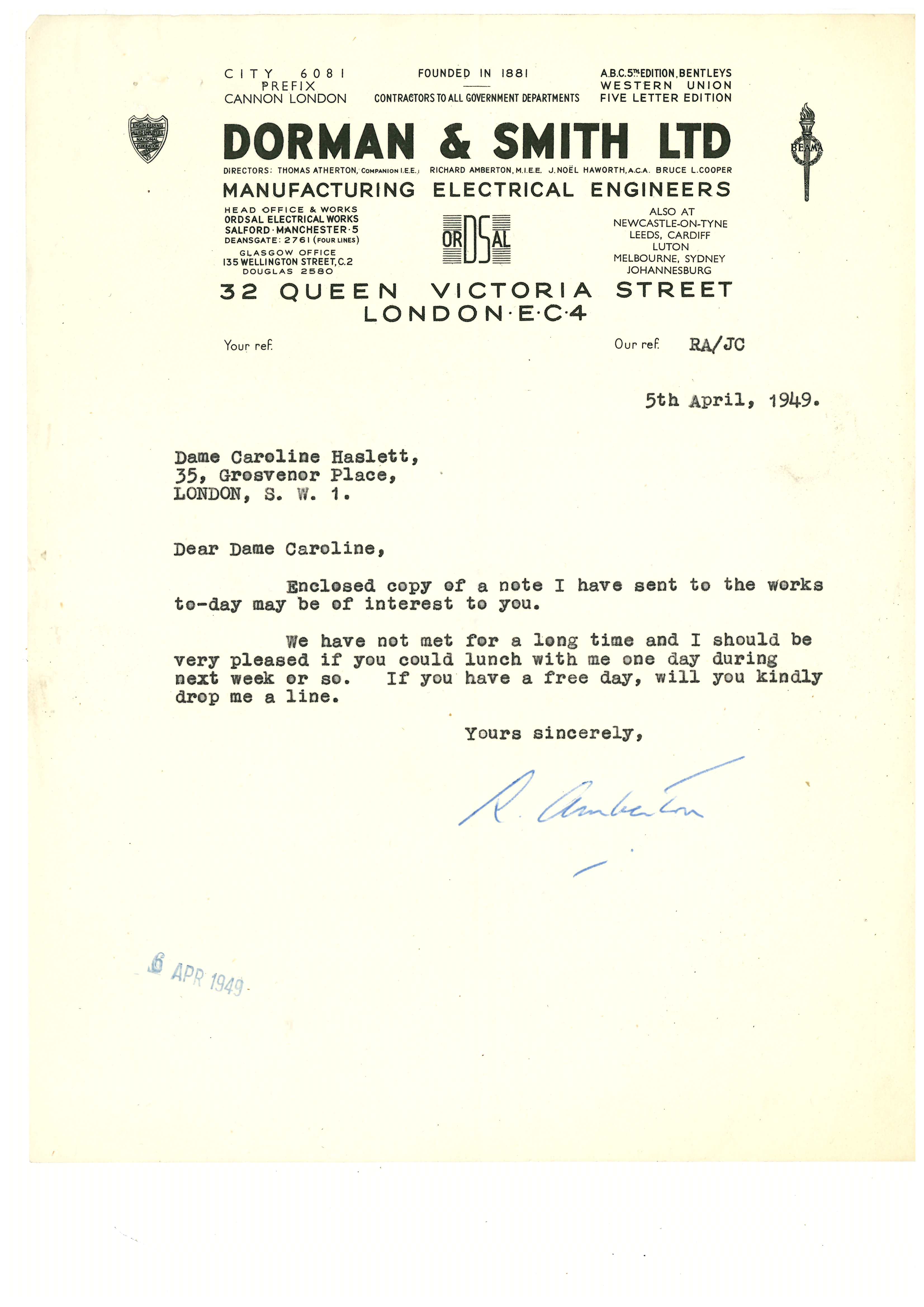 The personal papers of Dame Caroline Haslett are held in the Archives (reference NAEST 033). As we reopen the collections in the Archives to members and researchers in 2021, we can also restart some of our own cataloguing and research projects that have been on hold over the last 18 months. One such project is the re-cataloguing of the Haslett correspondence, and this is already shedding light on Caroline’s networks and demonstrating the extent of her personal influence in the post-war years.