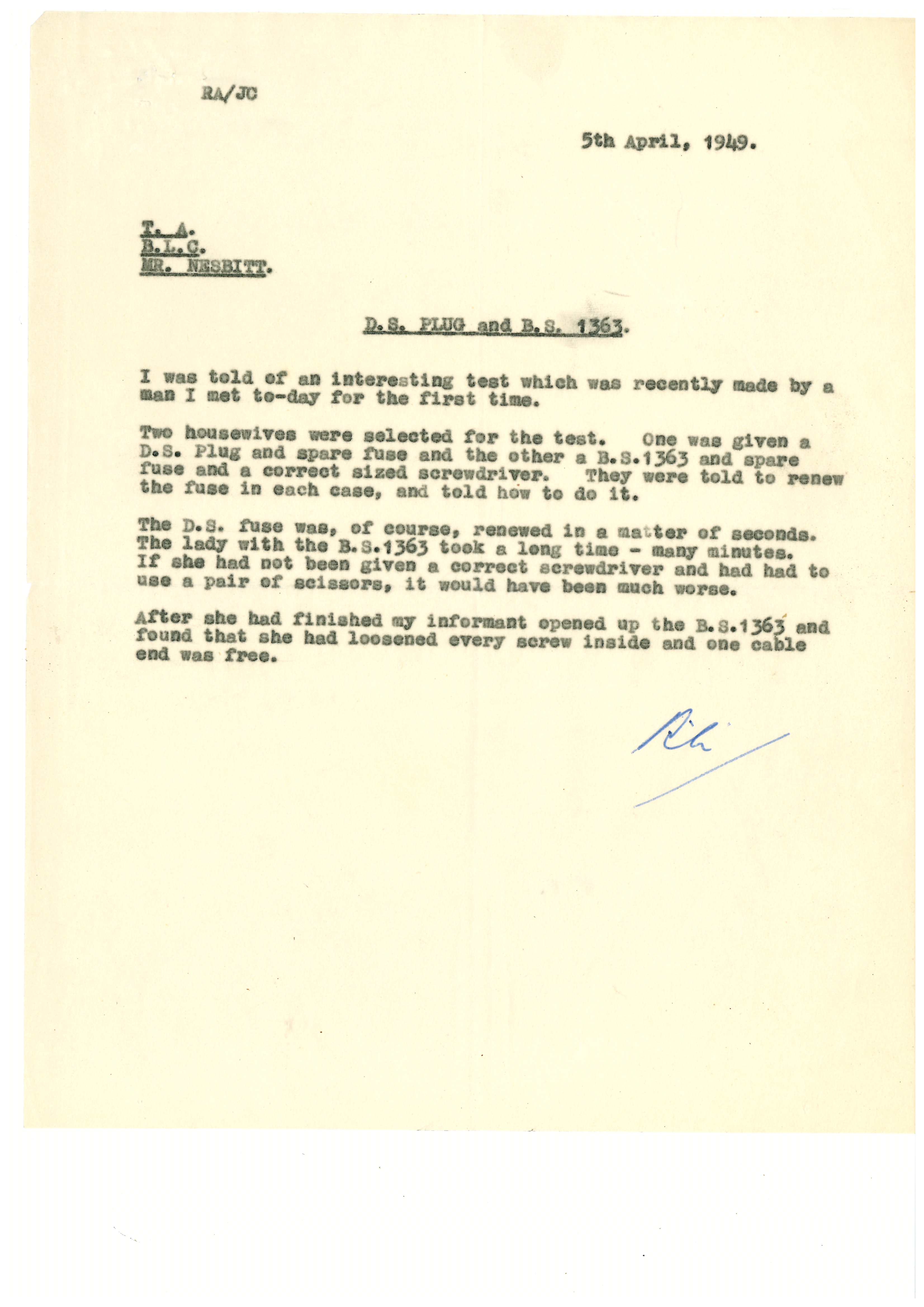 Caroline was a key figure in the expansion of domestic electricity in the UK. She was the only woman on the Institution of Electrical Engineers (IEE) committee on electrical installations in post-war housing, which reported in 1944. One of its recommendations was a safer, 3-pin electric plug, which would later become BS1363: more information can be found in the blog. An alternative technology was the Dorman plug, which was argued to be safer and more robust. Correspondence with Major Richard Amberton of Dorman and Smith shows him lobbying Caroline to give her support. He invites her to tour the factory and reports on a demonstration with local volunteers to show how easy and safe it is to change a Dorman plug.