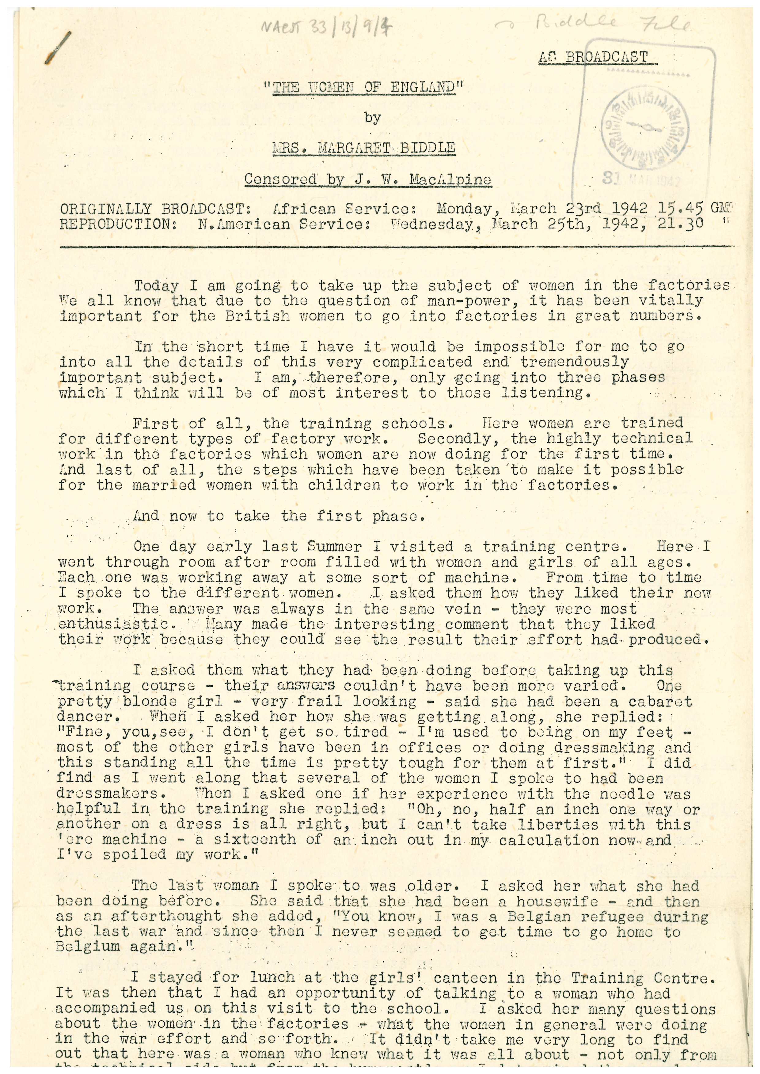 The role women played in wartime was the subject ‘The Women of England’, a radio broadcast by Margaret Drexel Biddle, who at that time was married to Anthony Drexel Biddle Junior, US Ambassador to Poland, Belgium, Czechoslovakia, Greece, Luxembourg, the Netherlands, Norway, and Yugoslavia. Margaret Biddle was another regular correspondent while her husband was stationed in London and Paris in the 1940s, and the files include a typescript of the broadcast.