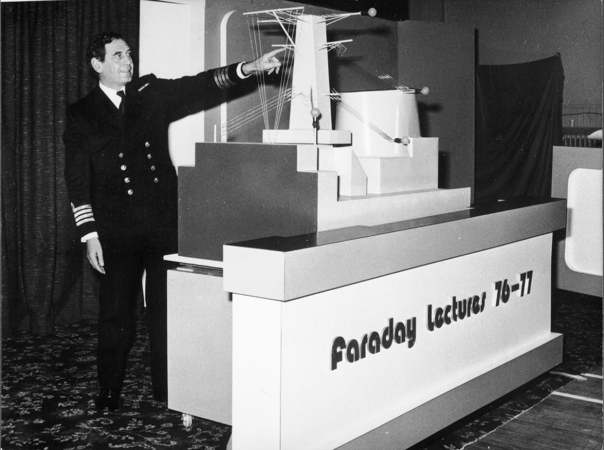 The 1976-1977 Faraday Lecture, presented by Rear Admiral L S Bryson, Royal Navy, and John Alvey, director of the Admiralty Surface Weapons Establishment, were a combination of practical demonstrations, working models, slides, film and television. This all helped to illustrate some of the many applications of electrical and electronic engineering on Her Majesty’s ships. The lecturers showed that every branch of electrical engineering is represented in the Royal Navy- from the earliest use of magnetism for navigation to more recently for magnetic mines.