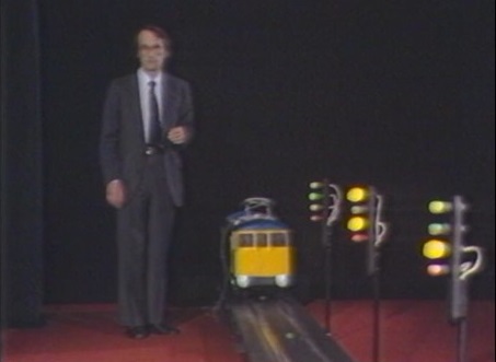 The 1981-1982 ‘Railways have an electric future’ was presented by seven lecturers who gave a total of 34 lectures in 15 locations to an audience of 70,000! To demonstrate signalling systems a large model train ran along the length of the stage showing how signals change to protect the train by stopping and showing other trains following.