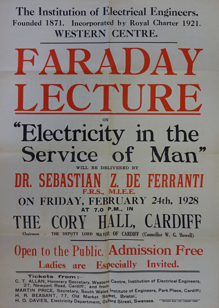 Sebastian de Ferranti, innovator in the development of electrical engineering, power generation and distribution, was IEE President in 1910-1911. He was awarded the Faraday Medal in 1924. In 1928 he gave his Faraday Lecture, ‘Electricity in the service of man’. This lecture was delivered an astonishing ten times to the IEE’s Centres around the United Kingdom, starting in London then moving to the North Midlands, Liverpool, North West, West, Sheffield, Dublin, Scotland and finishing in the South Midlands. The lecture encompassed the great and wonderfully varied uses of electricity to aid our work, leisure, productivity, travel and entertainment.