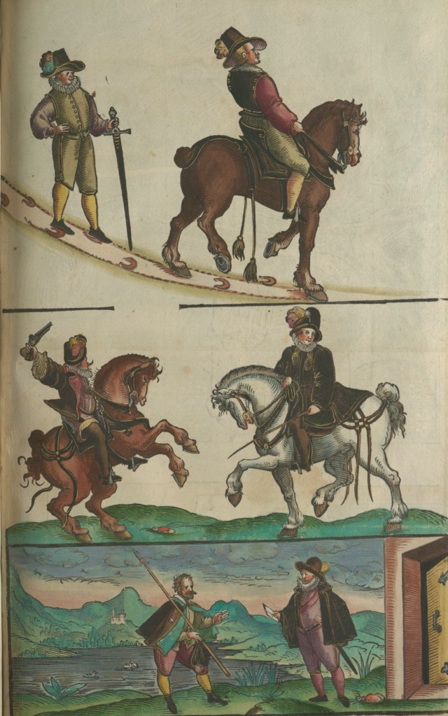 The illustrations of surveyor’s reveal the fashion of the time. Elizabethan clothing for men emphasised the muscles in their legs. The hose and garter by the knee was popular for this purpose. Similarly, the waist would be highlighted by the wearing of breeches (short trousers) topped off with a fitted doublet (short tight jacket).