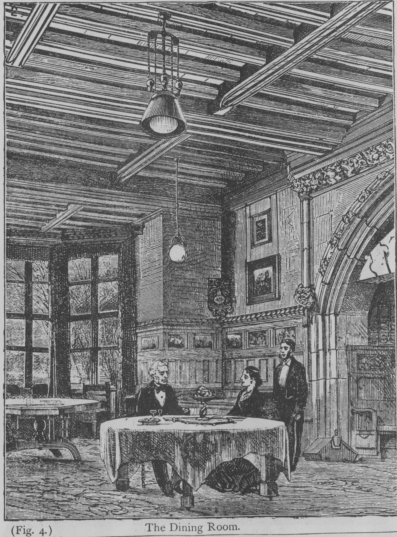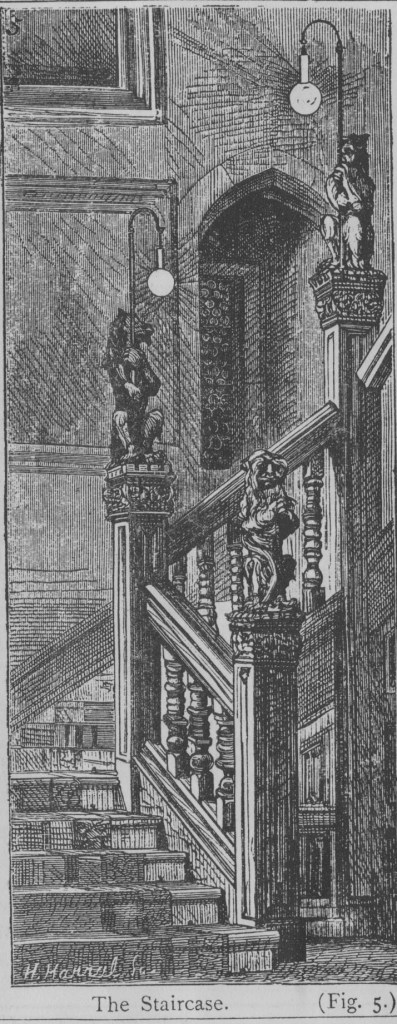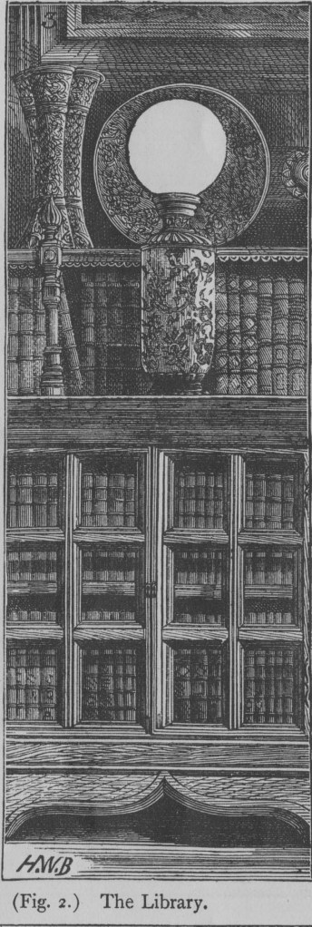 The Library was lit by eight lamps, four clustered in one globe of ground glass, suspended from the ceiling. Armstrong was not only one for renewable energy, he also repurposed fixtures within his home too. The remaining lamps were placed in globes ‘upon vases which were previously used as stands for duplex kerosene lamps.’ Armstrong continues to explain, the novel, yet hazardous, method for illuminating his Library,
